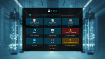Ema keeps an evolving emotional diary that reacts to your decisions, and a lore glossary expands as you progress.